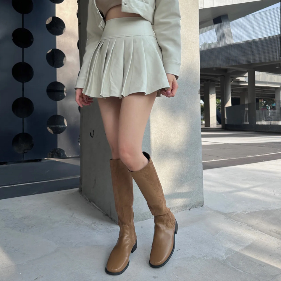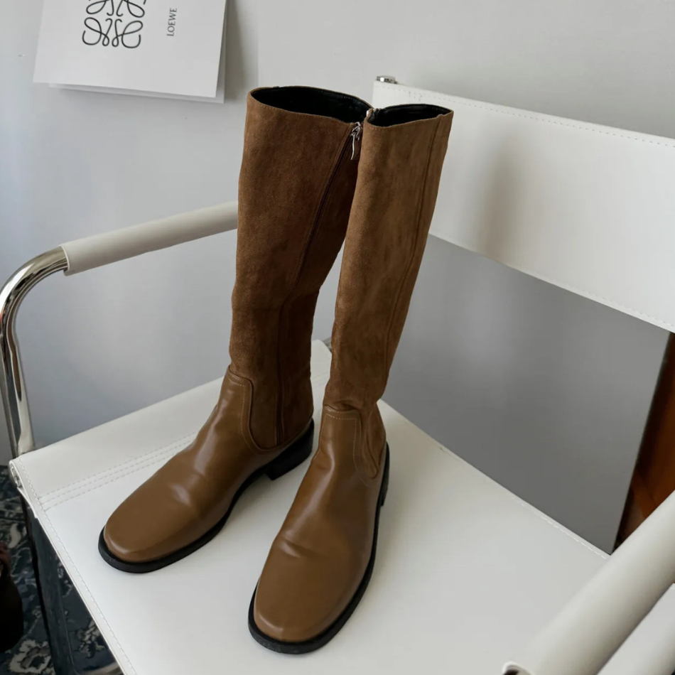 美式復古皮革+麂皮絨拼接長靴-2色
