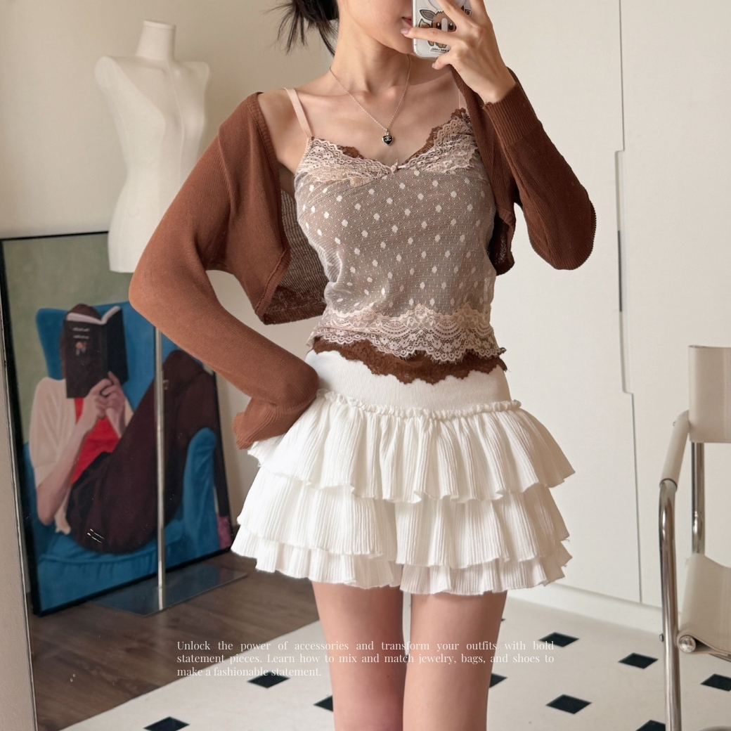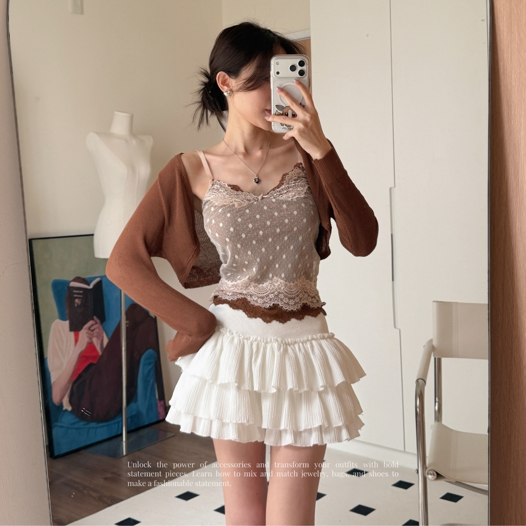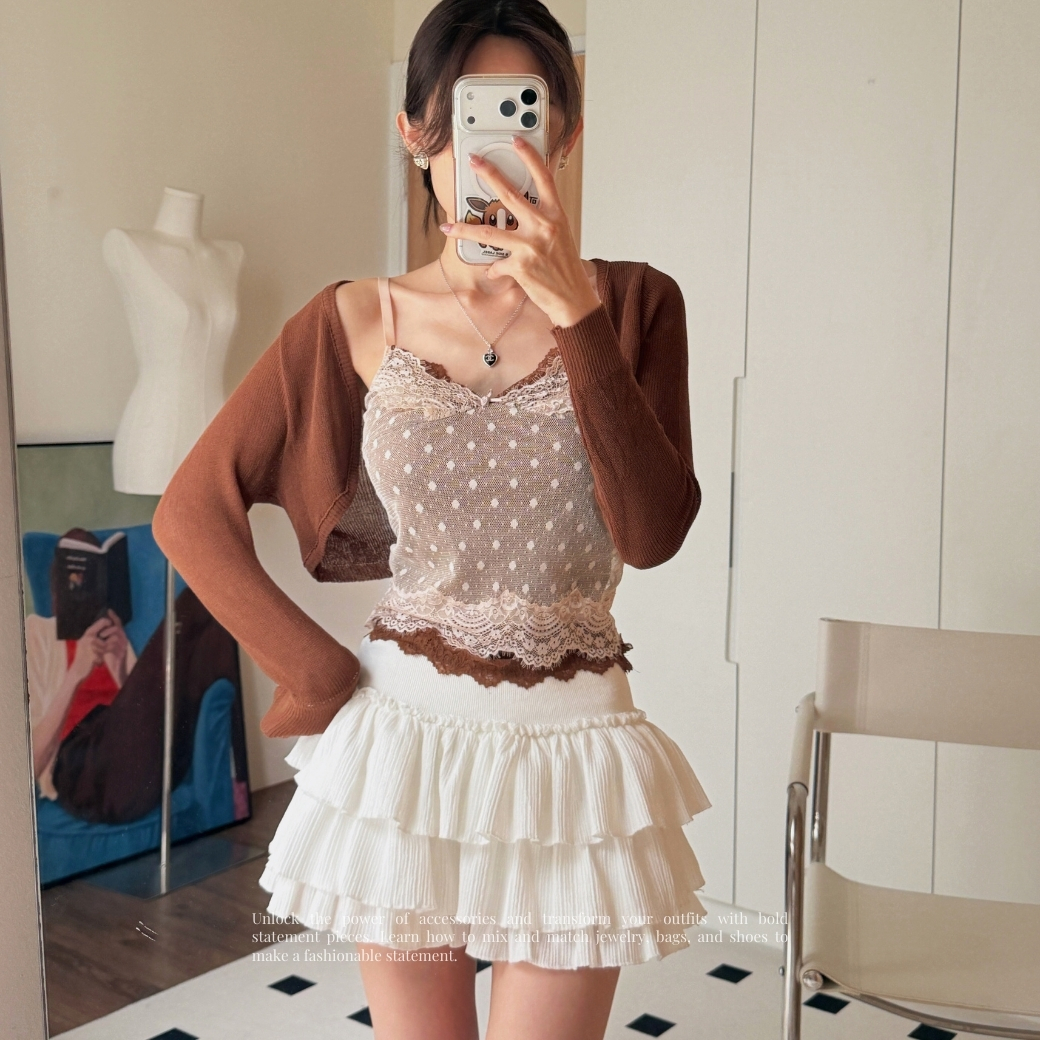 疊穿一件極短版咖色罩衫,視覺層次感直接封神。