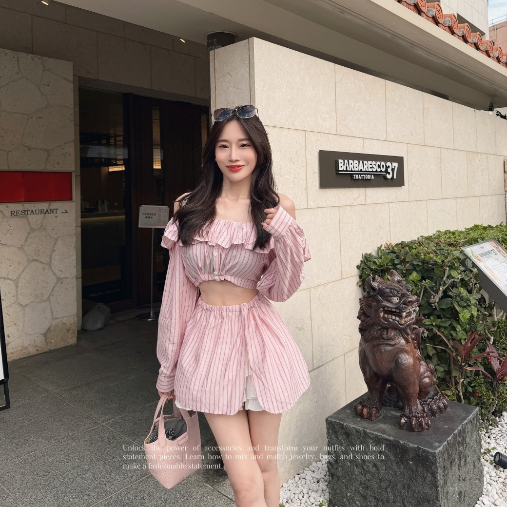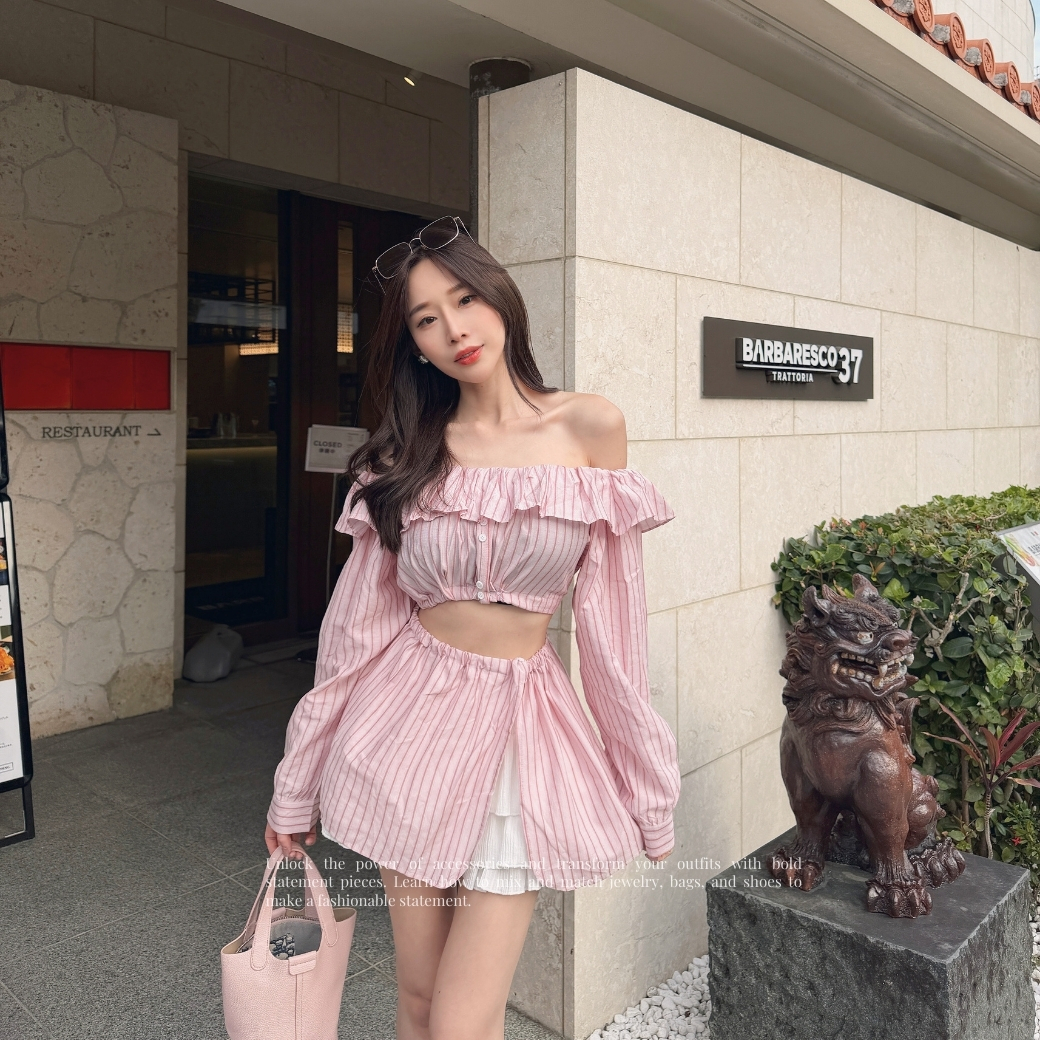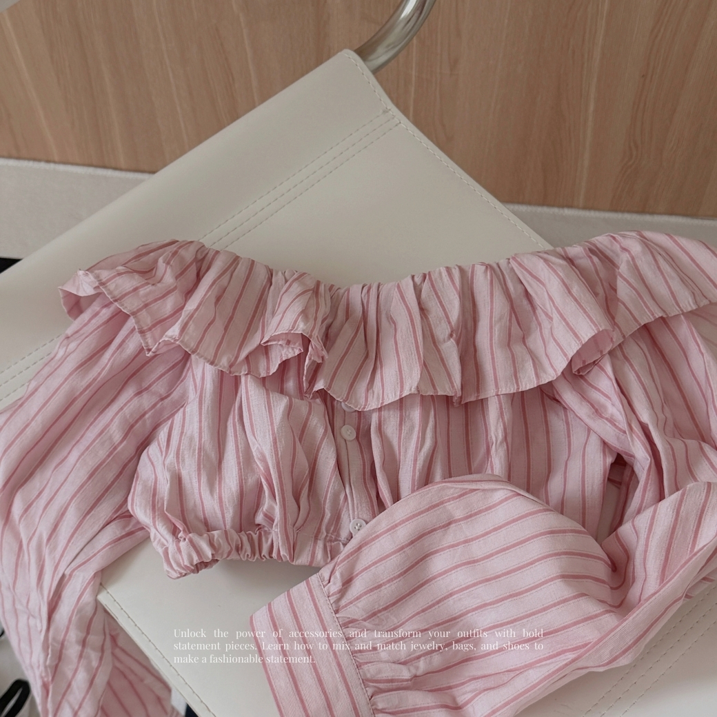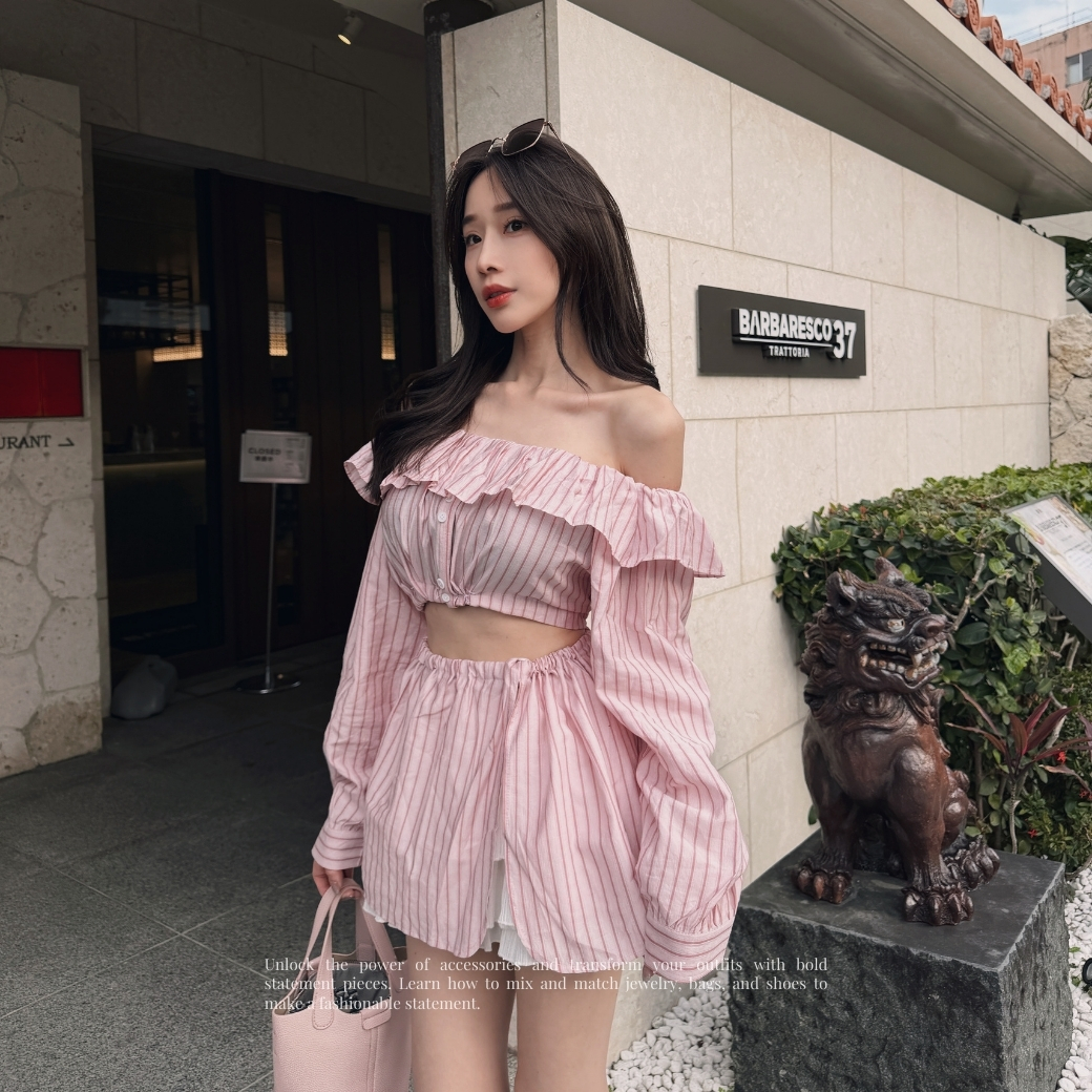 粉色條紋自帶清爽濾鏡,平口荷葉邊設計讓鎖骨線條直接封神。