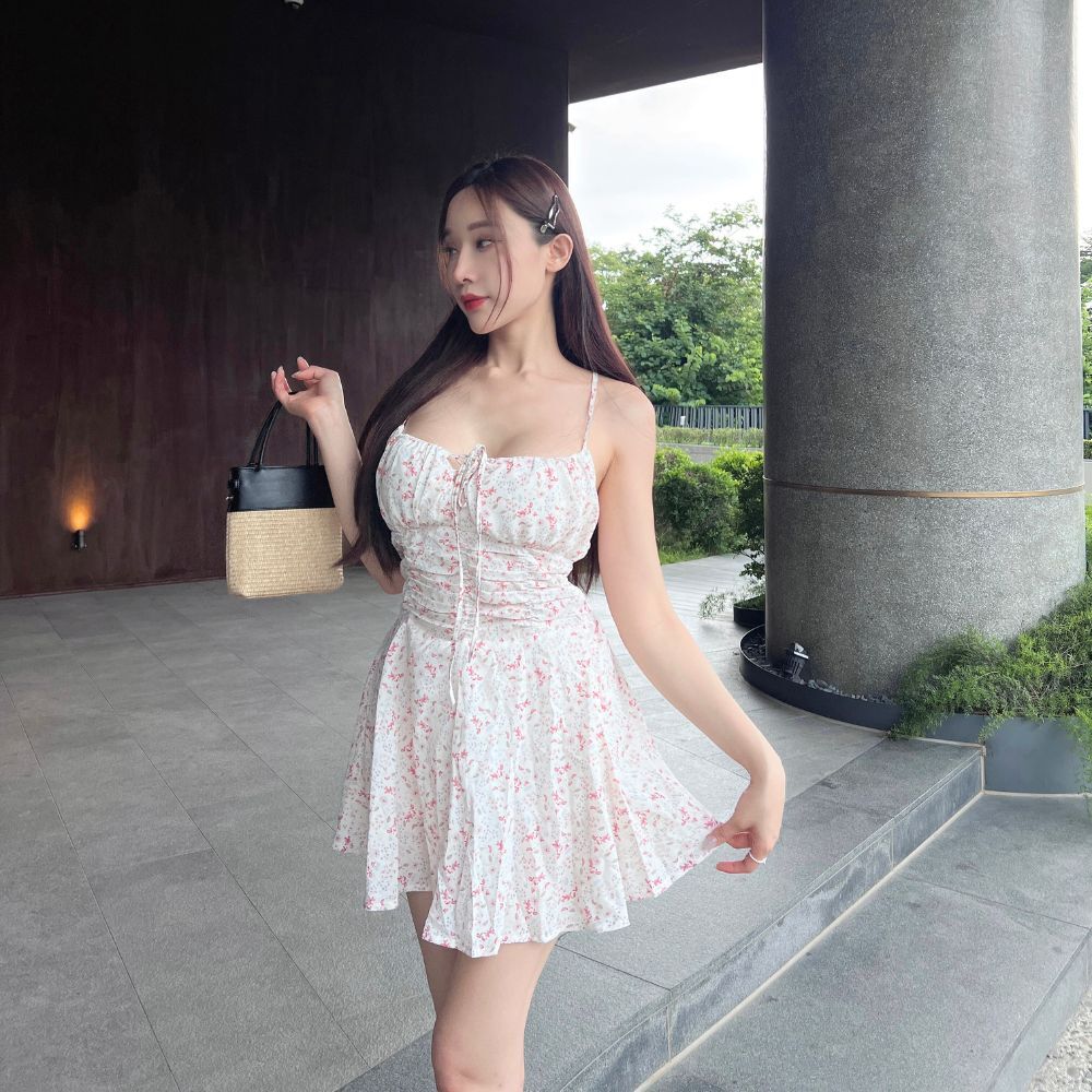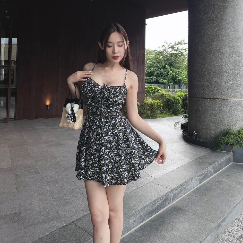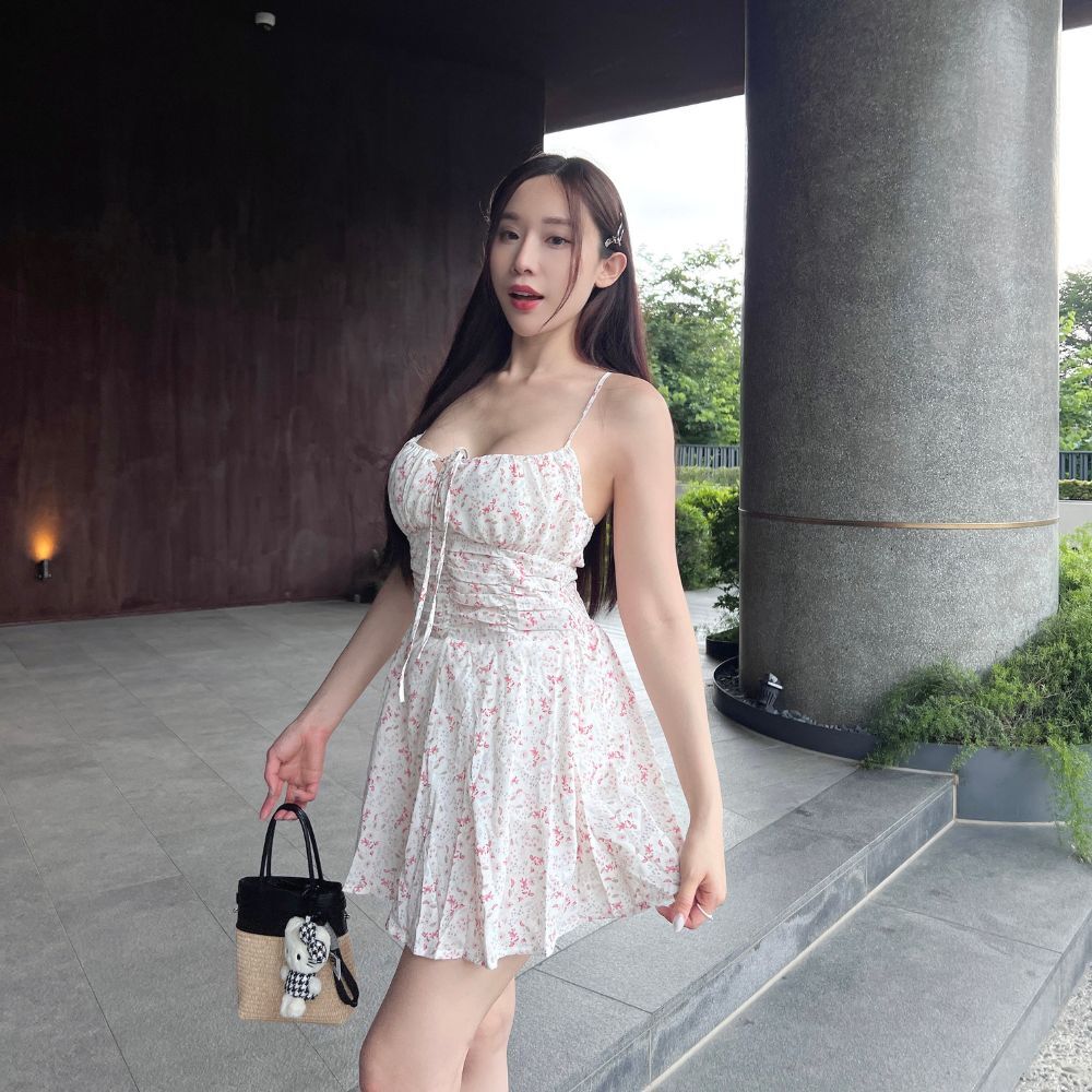細肩帶+胸前抓皺設計,讓身形線條更乾淨俐落