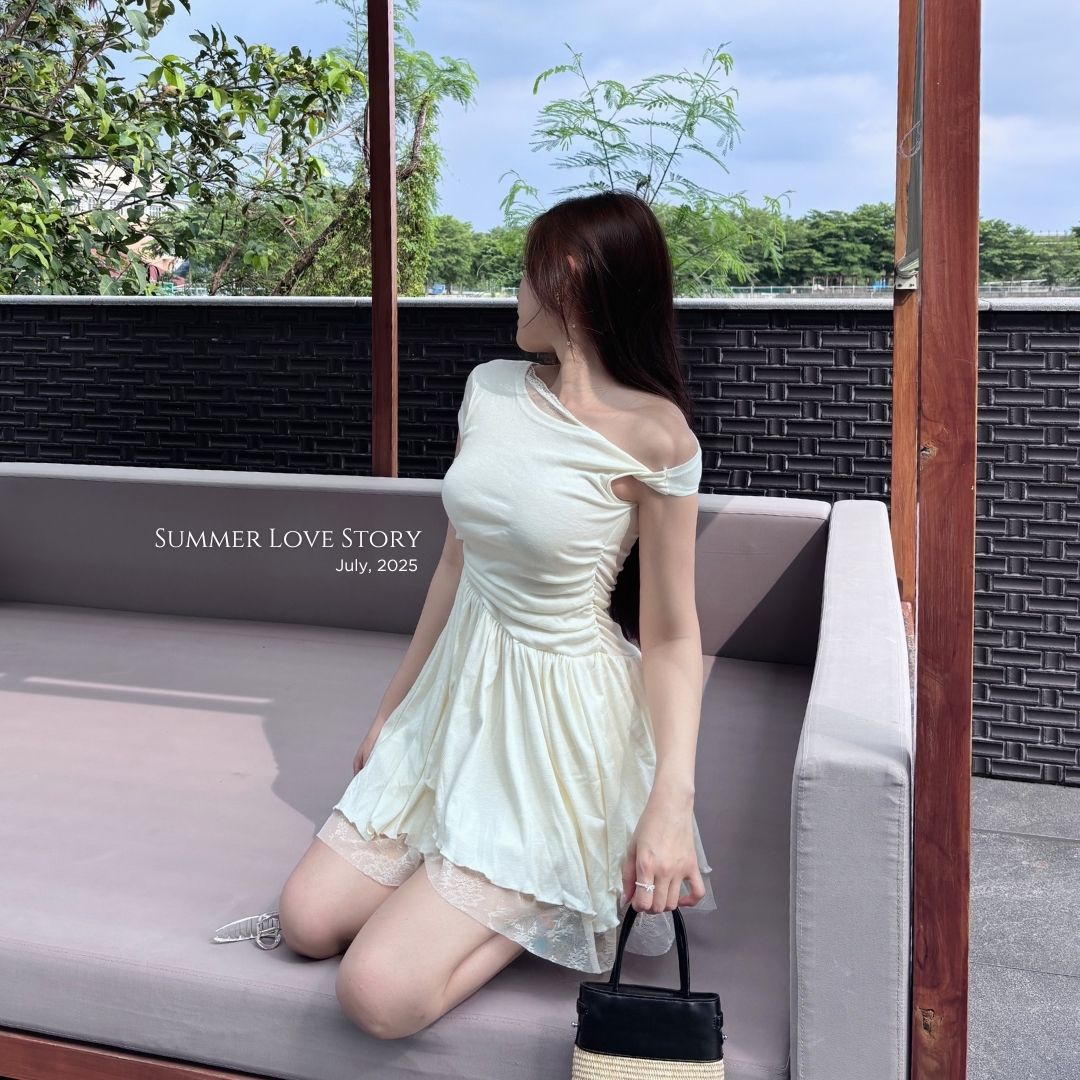 這件洋裝做了小心機的「斜肩設計+抓皺剪裁」,