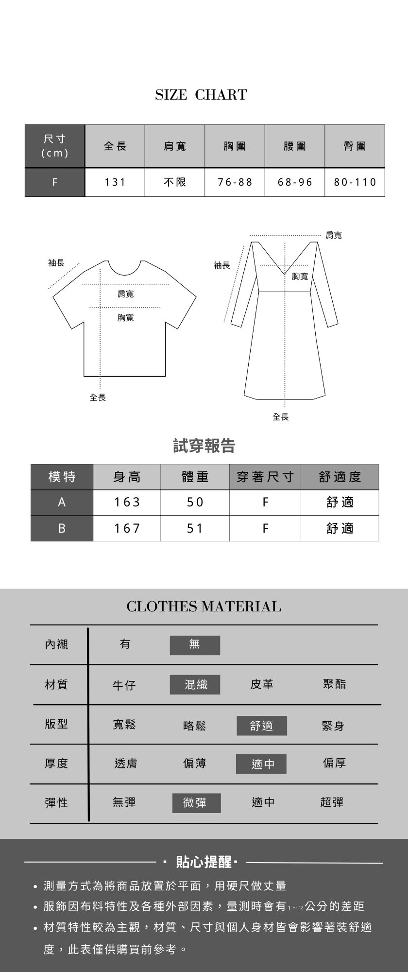 全長131  肩寬不限  胸圍76-88  腰圍68-96    臀圍80-110  cm