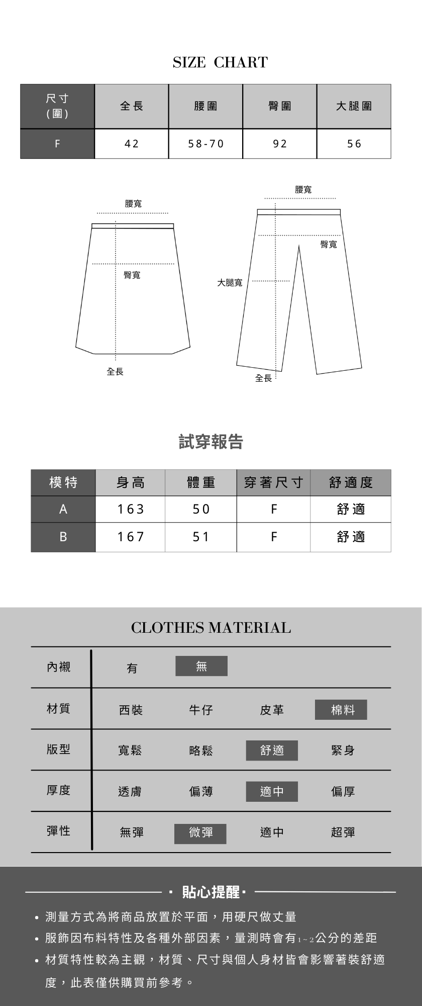 全長42 腰圍58-70 臀圍92內 腿圍56內 cm