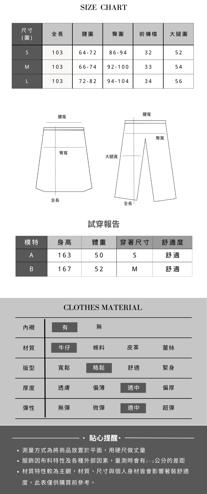 L 全長103 腰圍72-82 臀圍94-104 前襠長34 腿圍56 cm