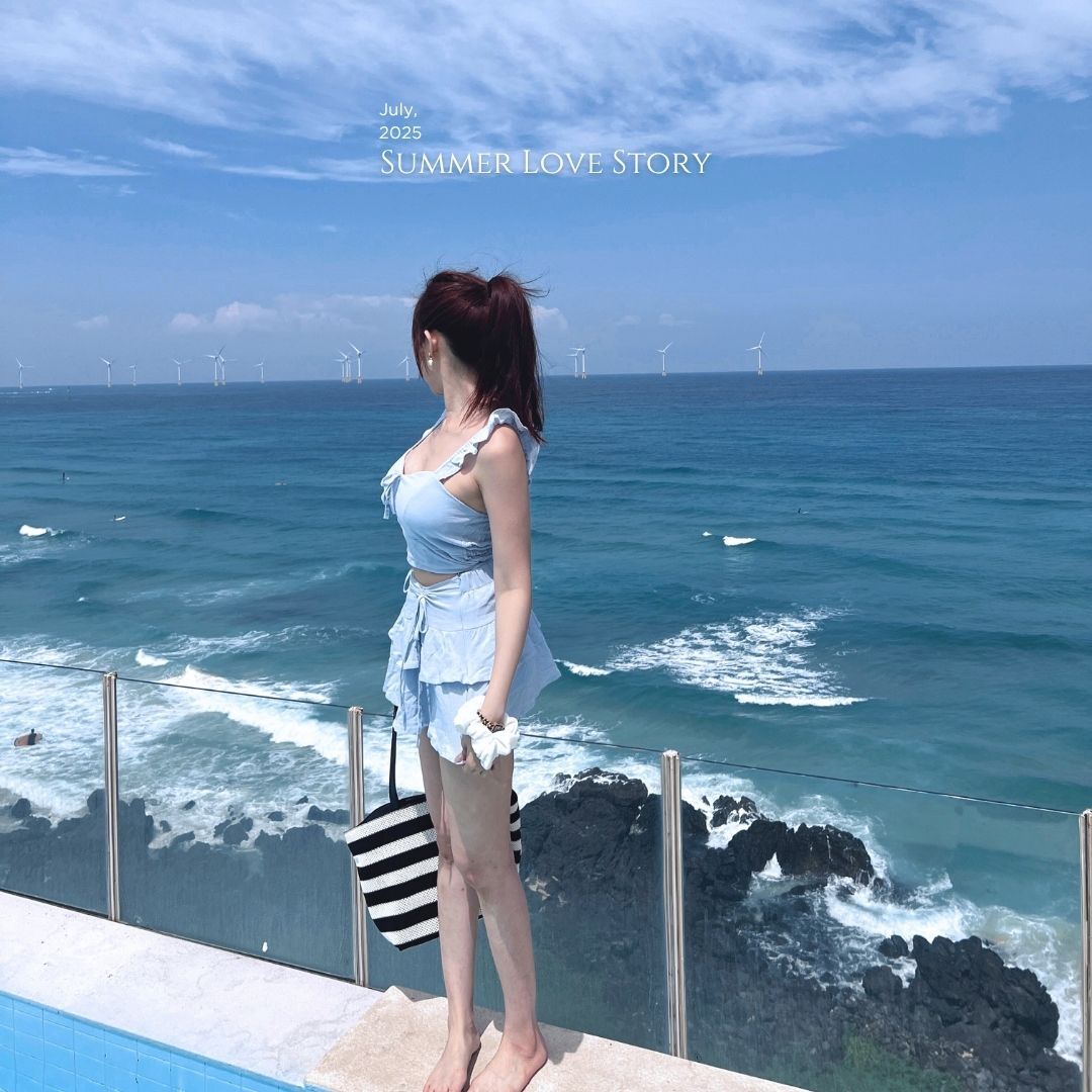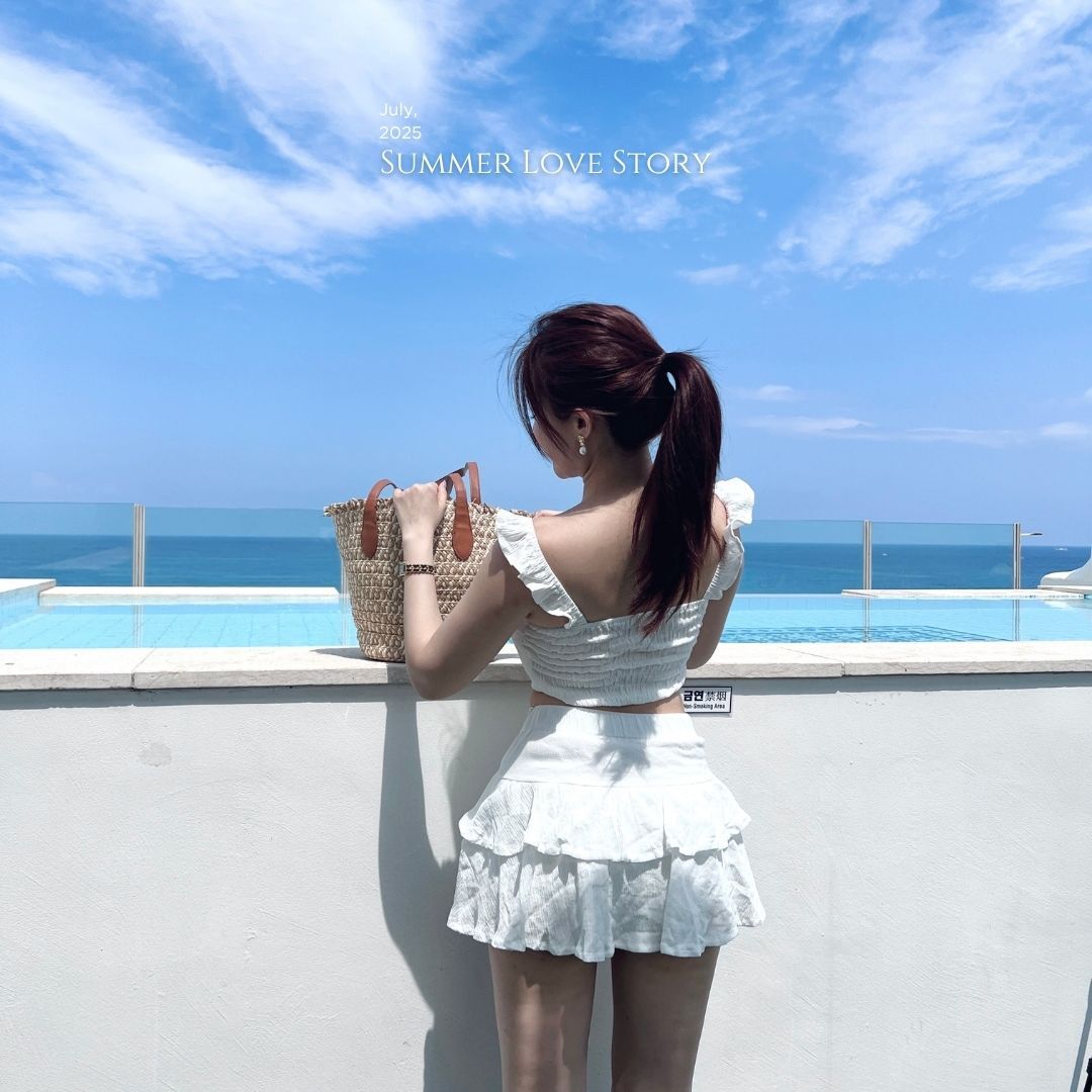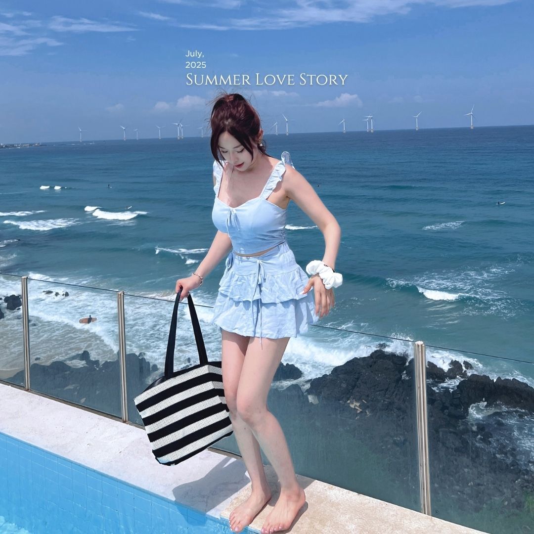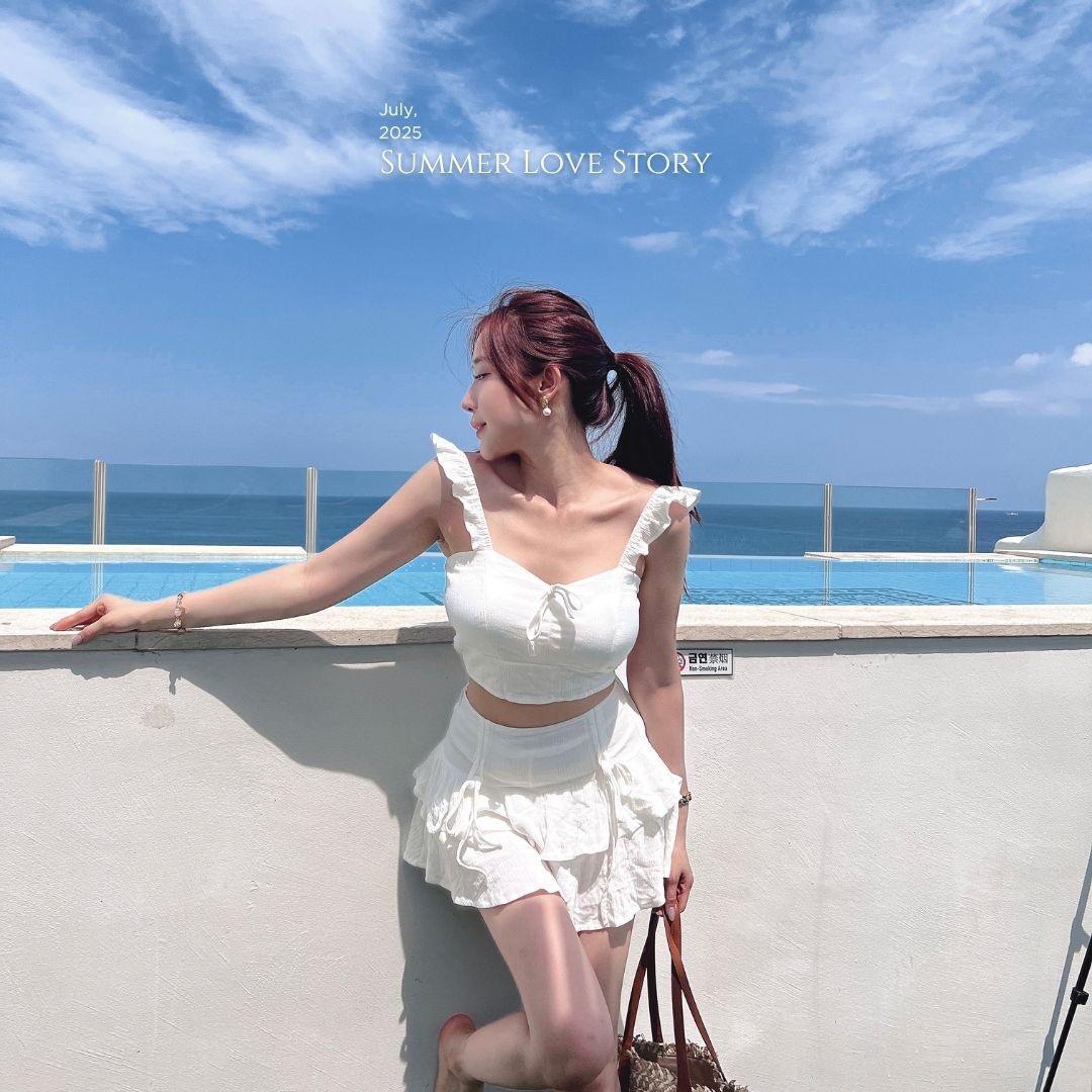🌊 上身是微辣的小吊帶設計,搭配荷葉邊甜感拉滿,