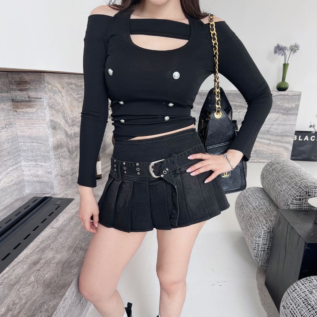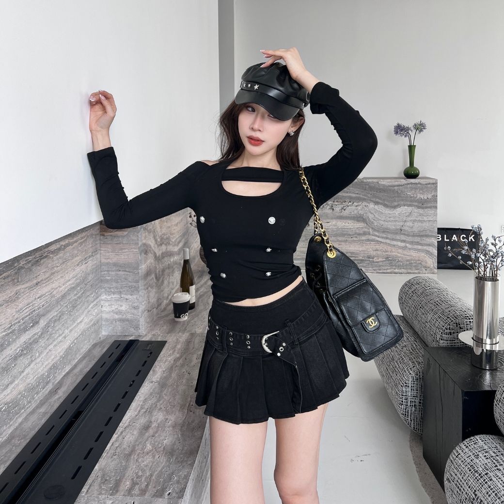 鏤空露肩剪裁搭配短裙,