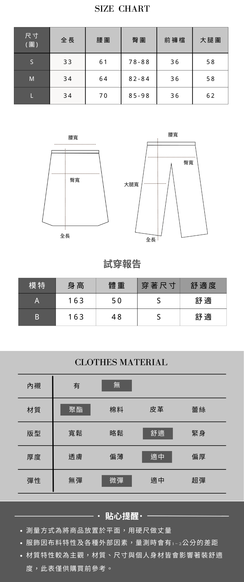 S號:全長33 腰圍61 臀圍78-88 前檔長36 腿圍58 cm