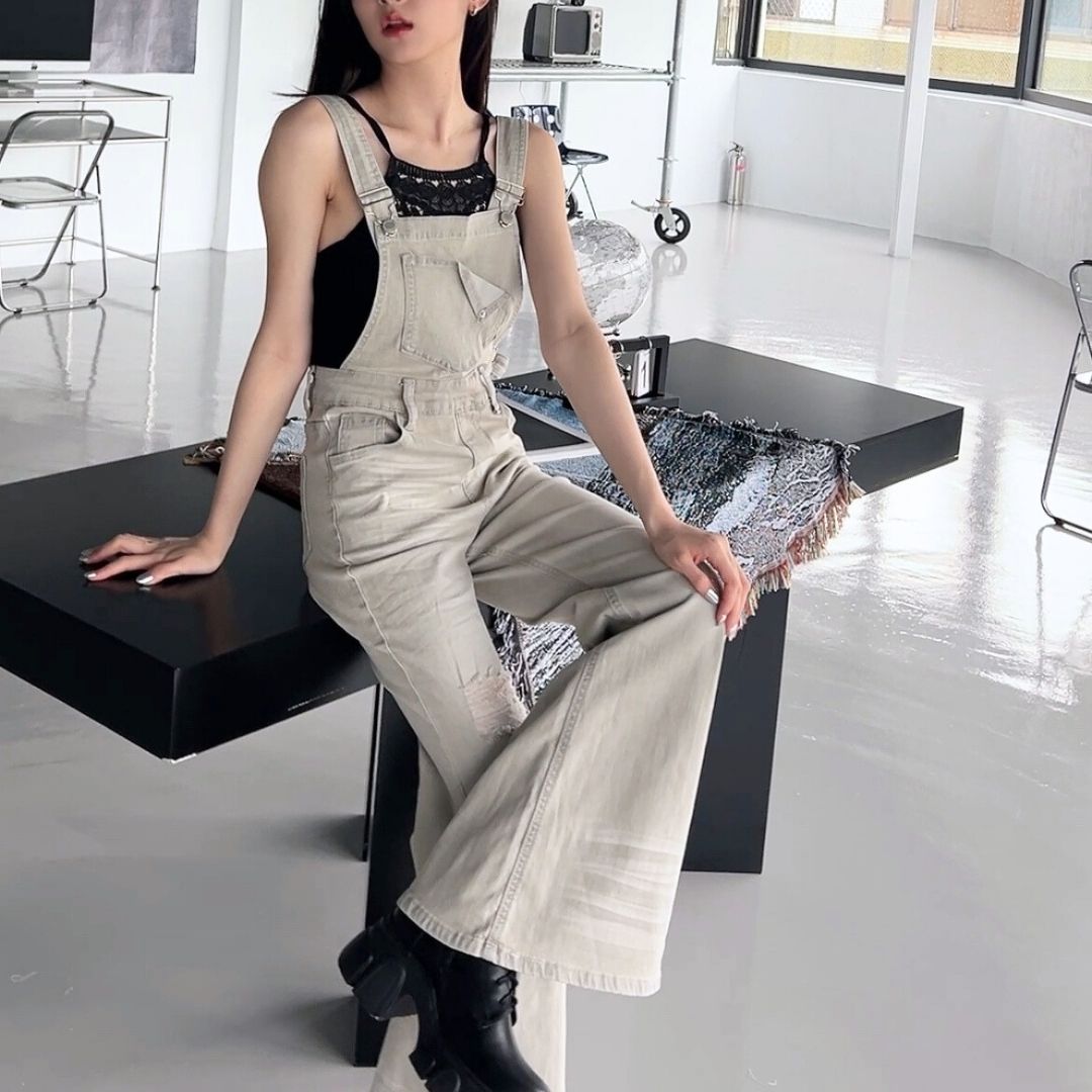 微刷破、水洗灰米色、不對稱剪裁口袋、