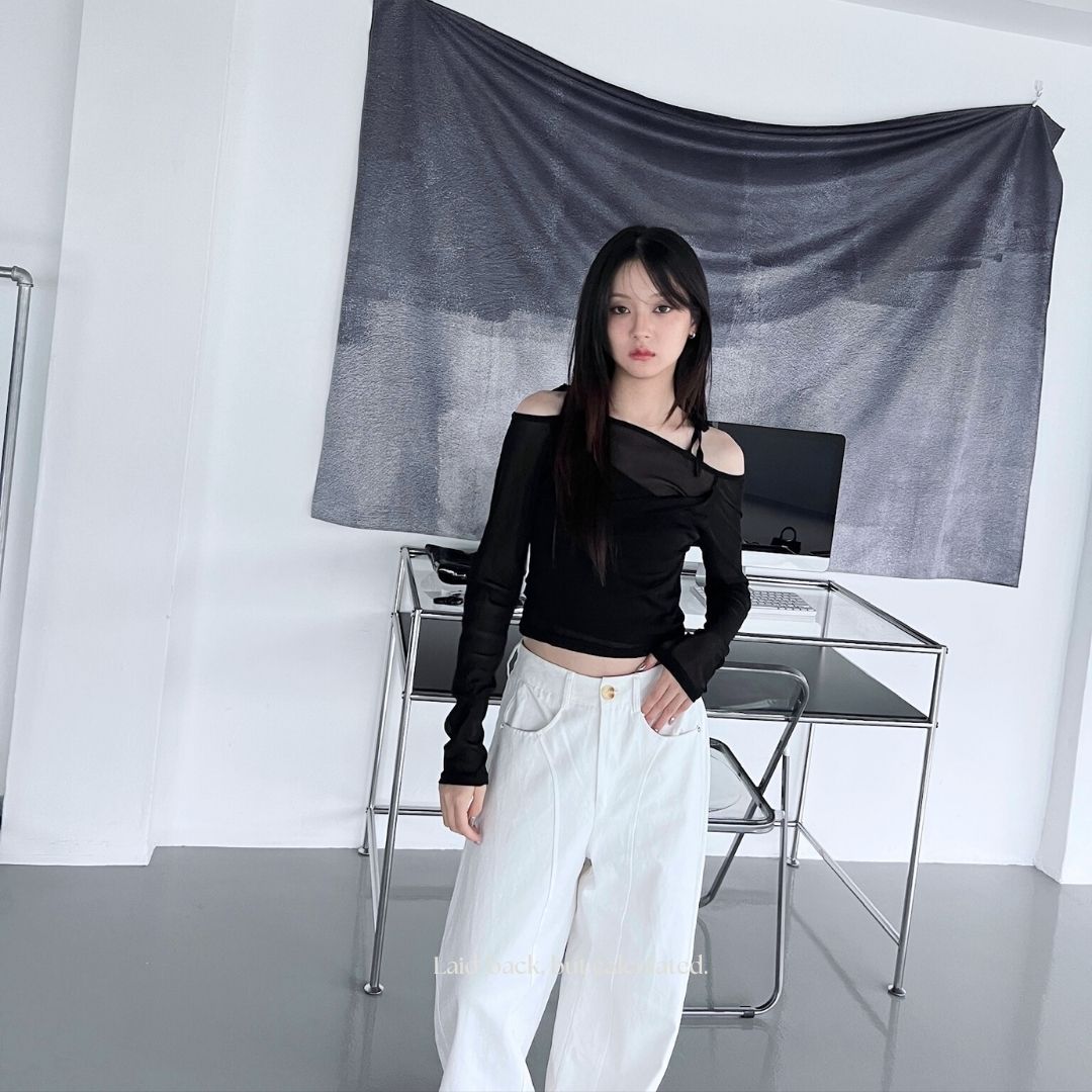 將輕紗的柔軟感與露肩綁帶的線條感融合,