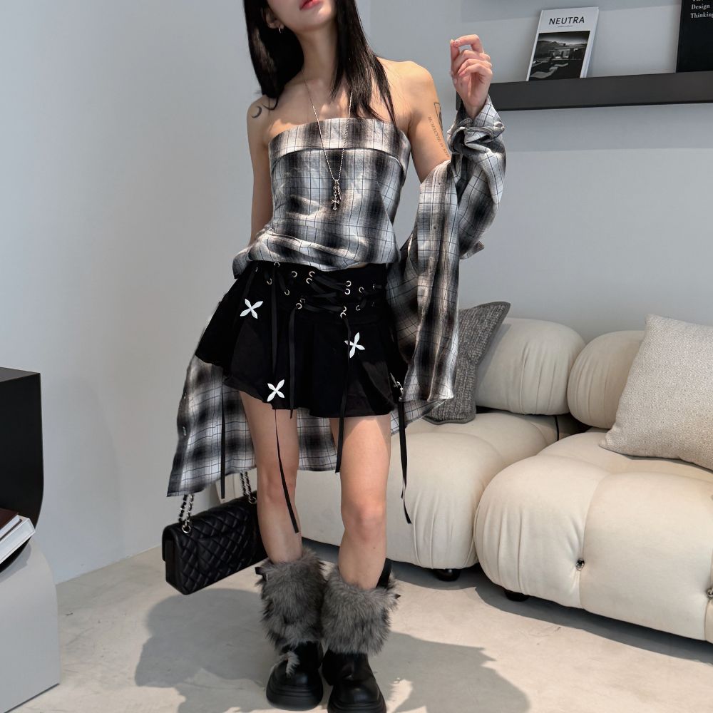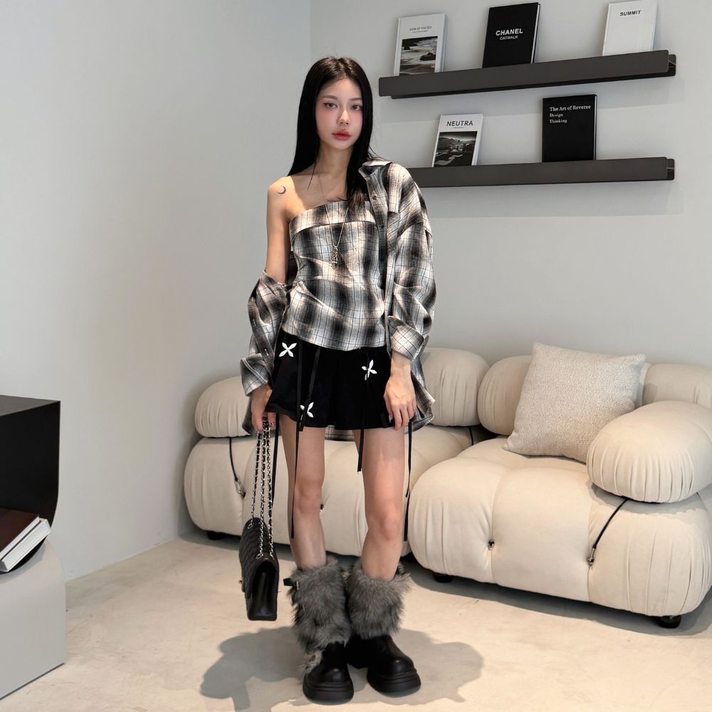 這款兩件套由 格紋平口抹胸 與 不對稱剪裁襯