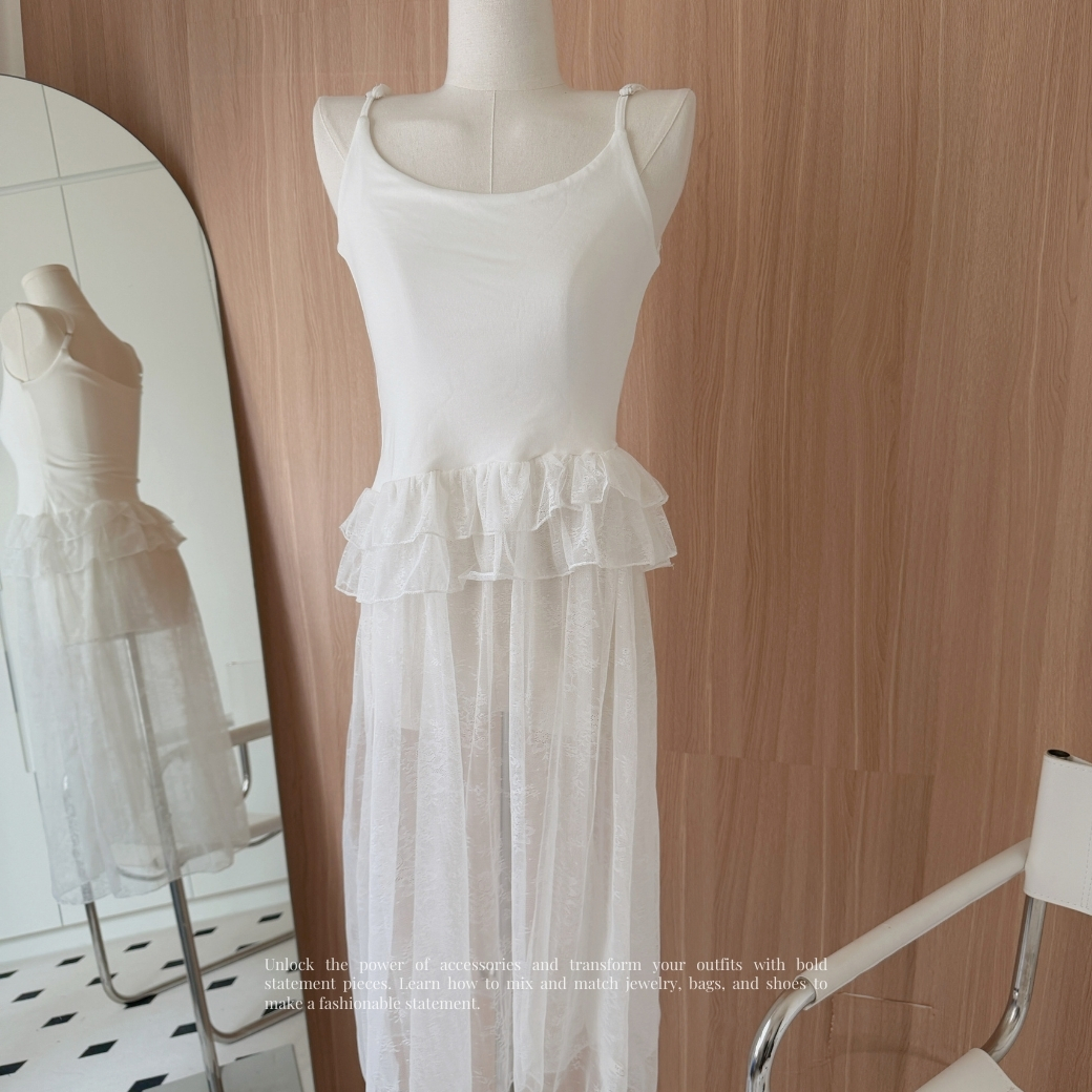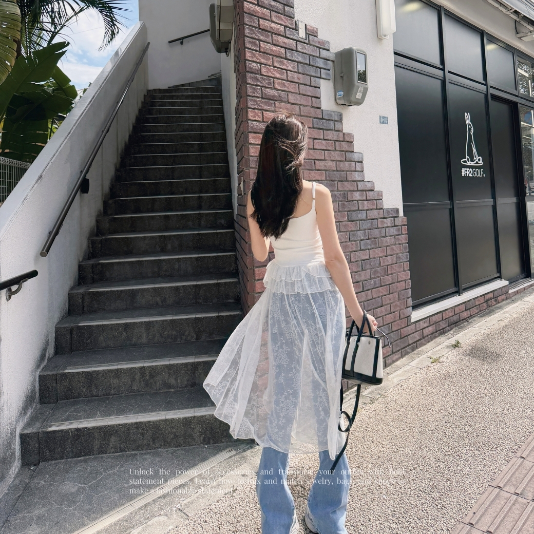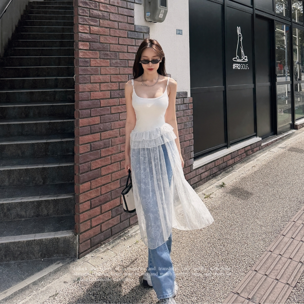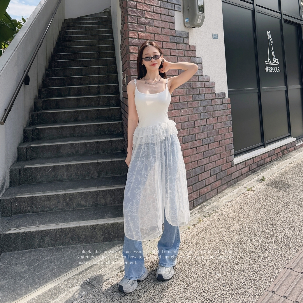 細肩帶合身背心拼接輕盈蕾絲網紗,