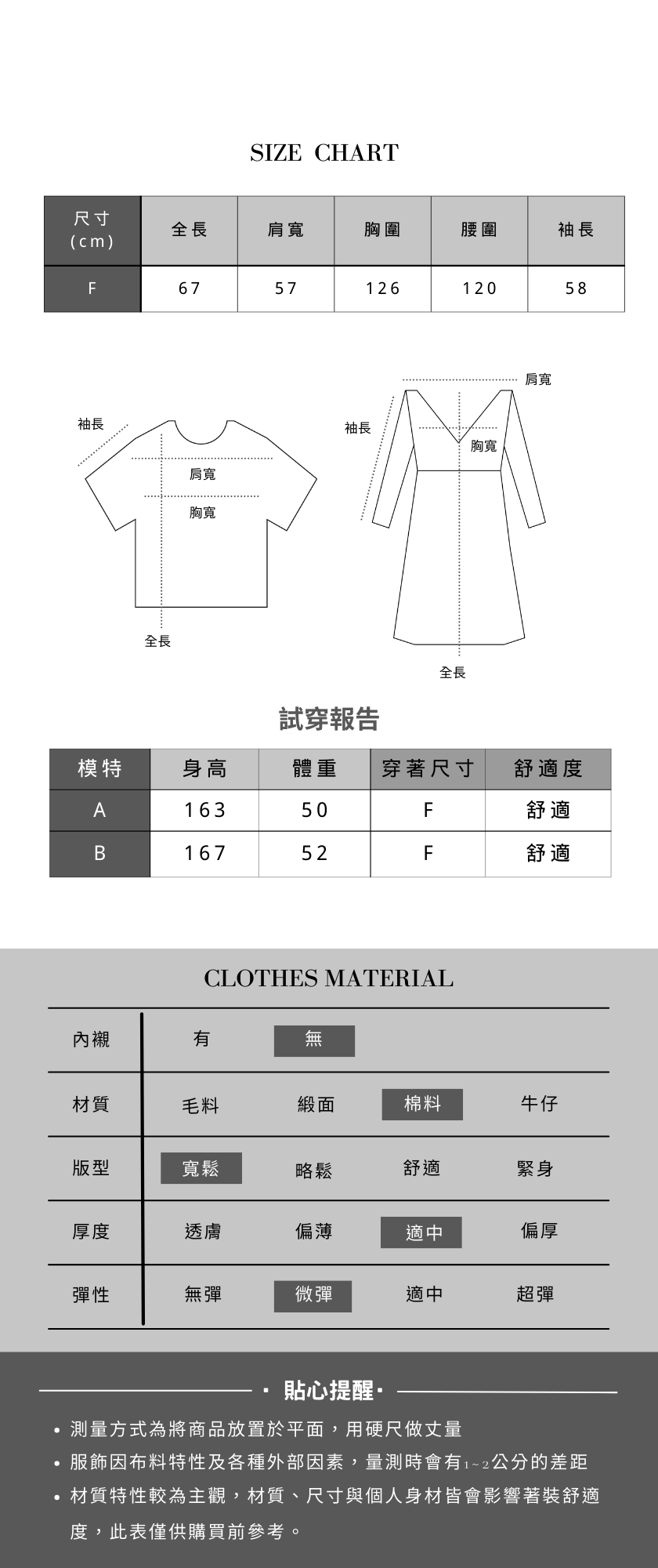 <尺寸>F 全長67 胸圍126 腰圍120 肩寬57 袖長58 cm