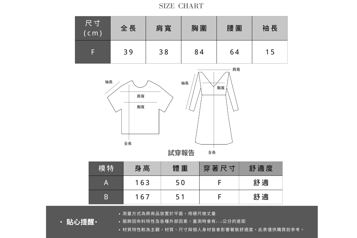 女款:全長39 肩寬38 胸圍84 腰圍64 袖長15 cm