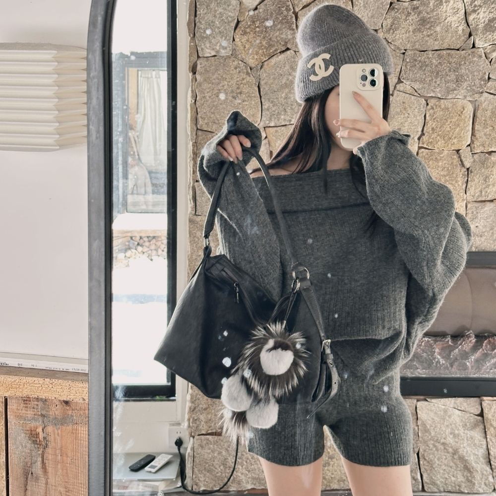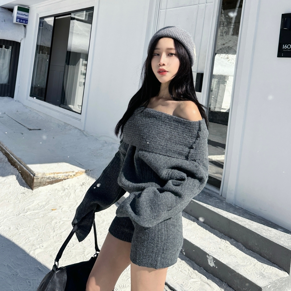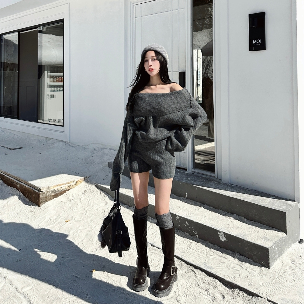 【慵懶王者】DOMISS顯瘦一字毛衣+短褲兩件套裝 洋裝 毛衣裙 毛衣套裝(現貨)
